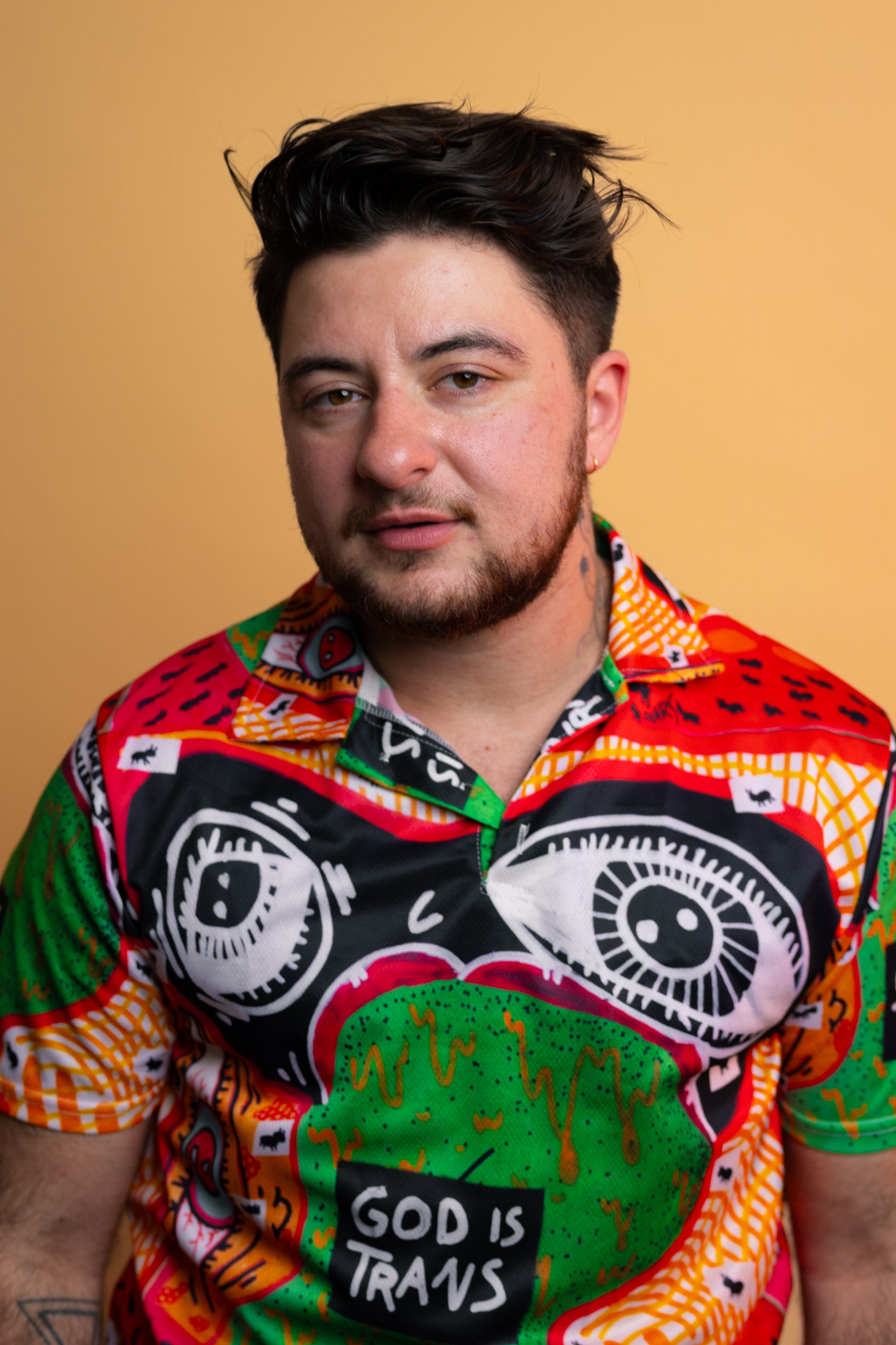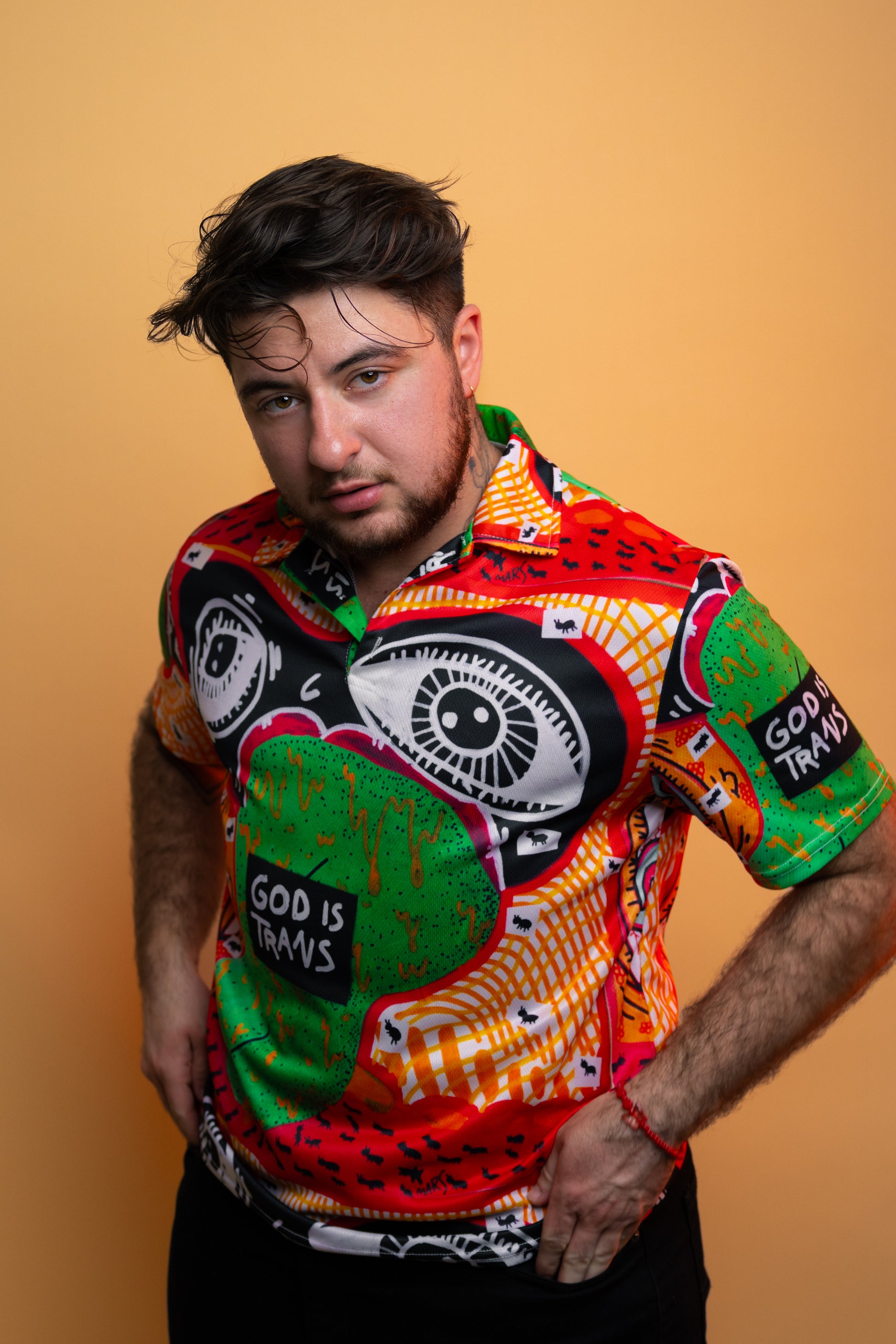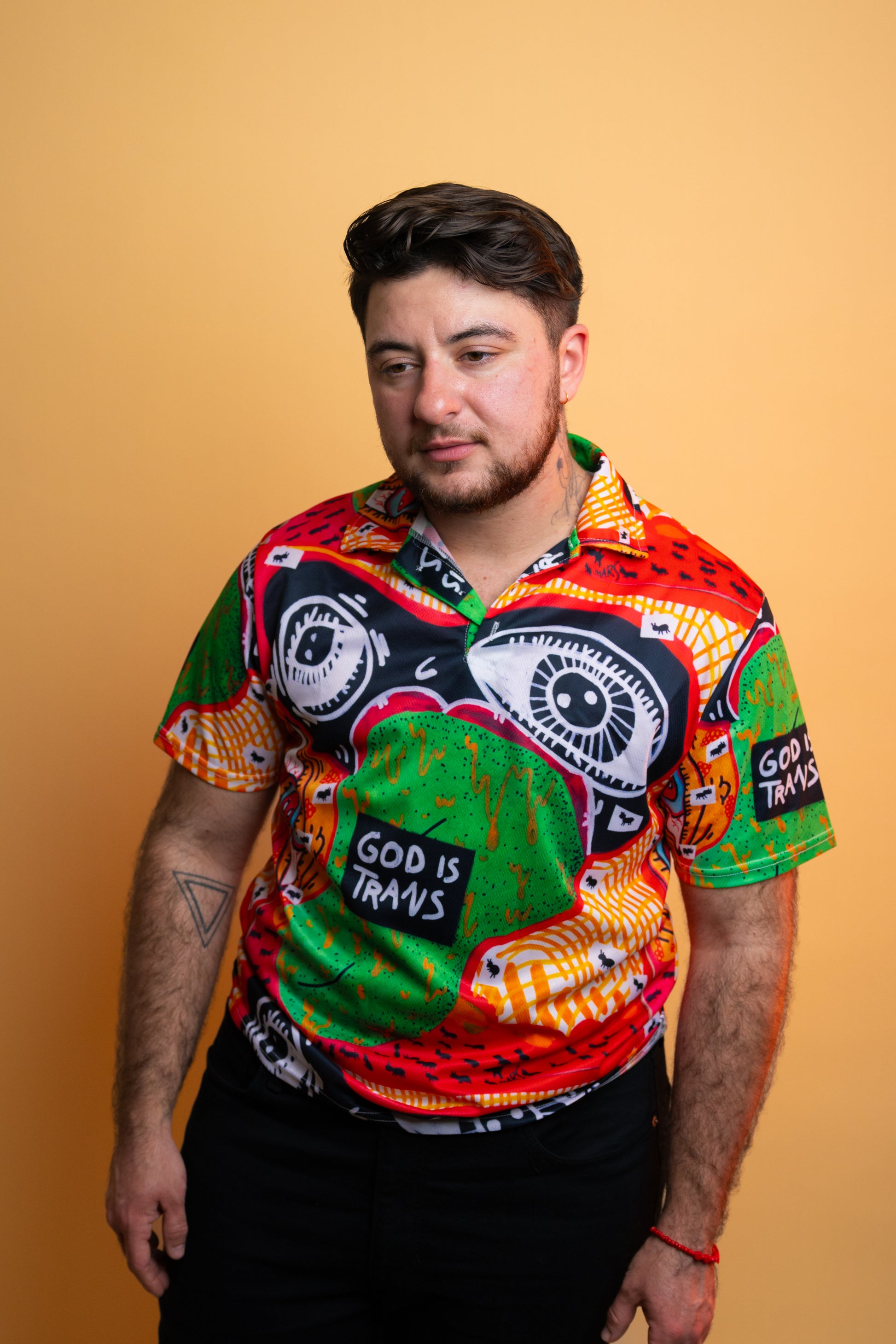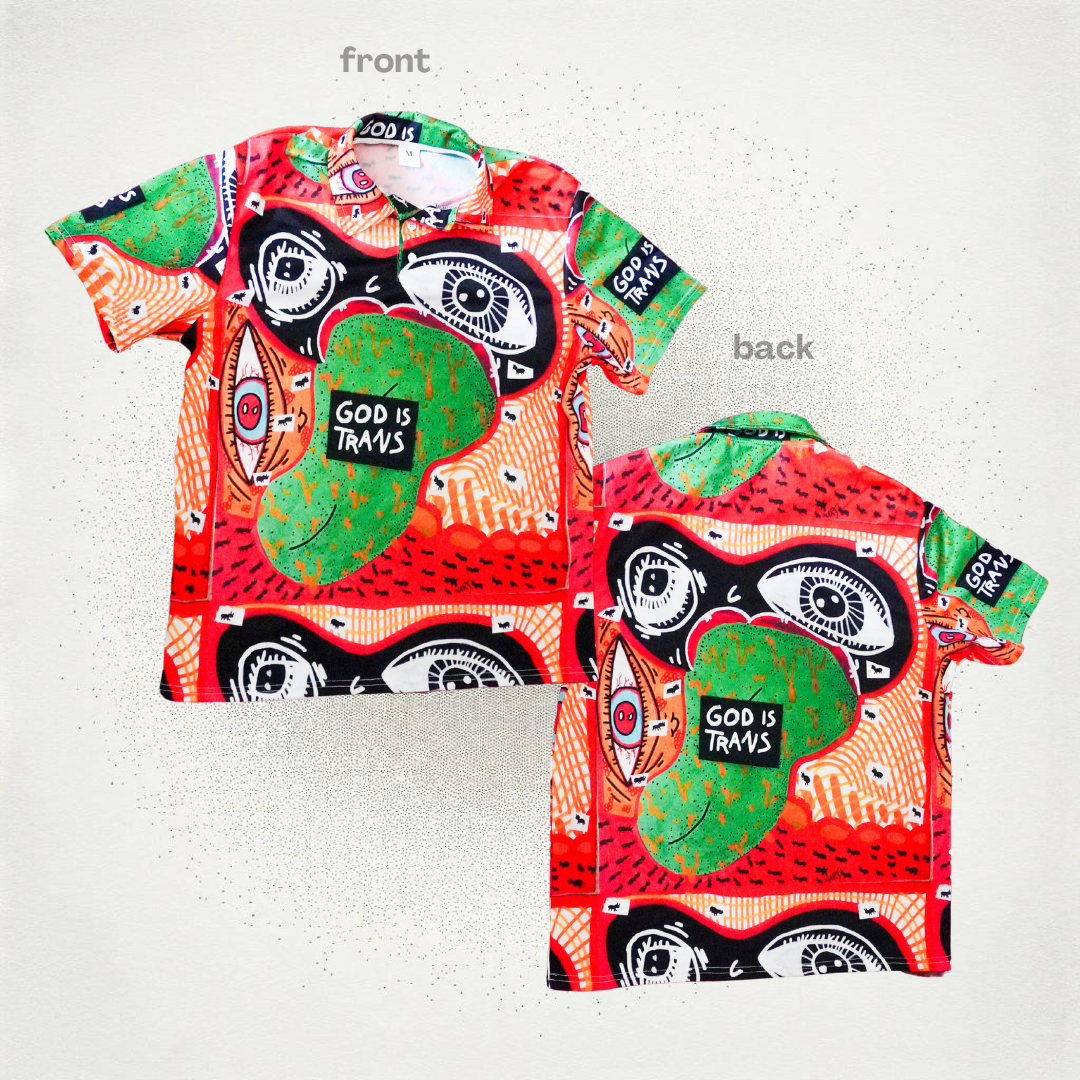 This polo is part of my God is Trans collection, which is all about embracing and celebrating trans identities. The eyes in the design symbolize the constant surveillance many trans people feel, but also serve as a beacon of hope and belonging. It’s a reminder that you belong exactly as you are.