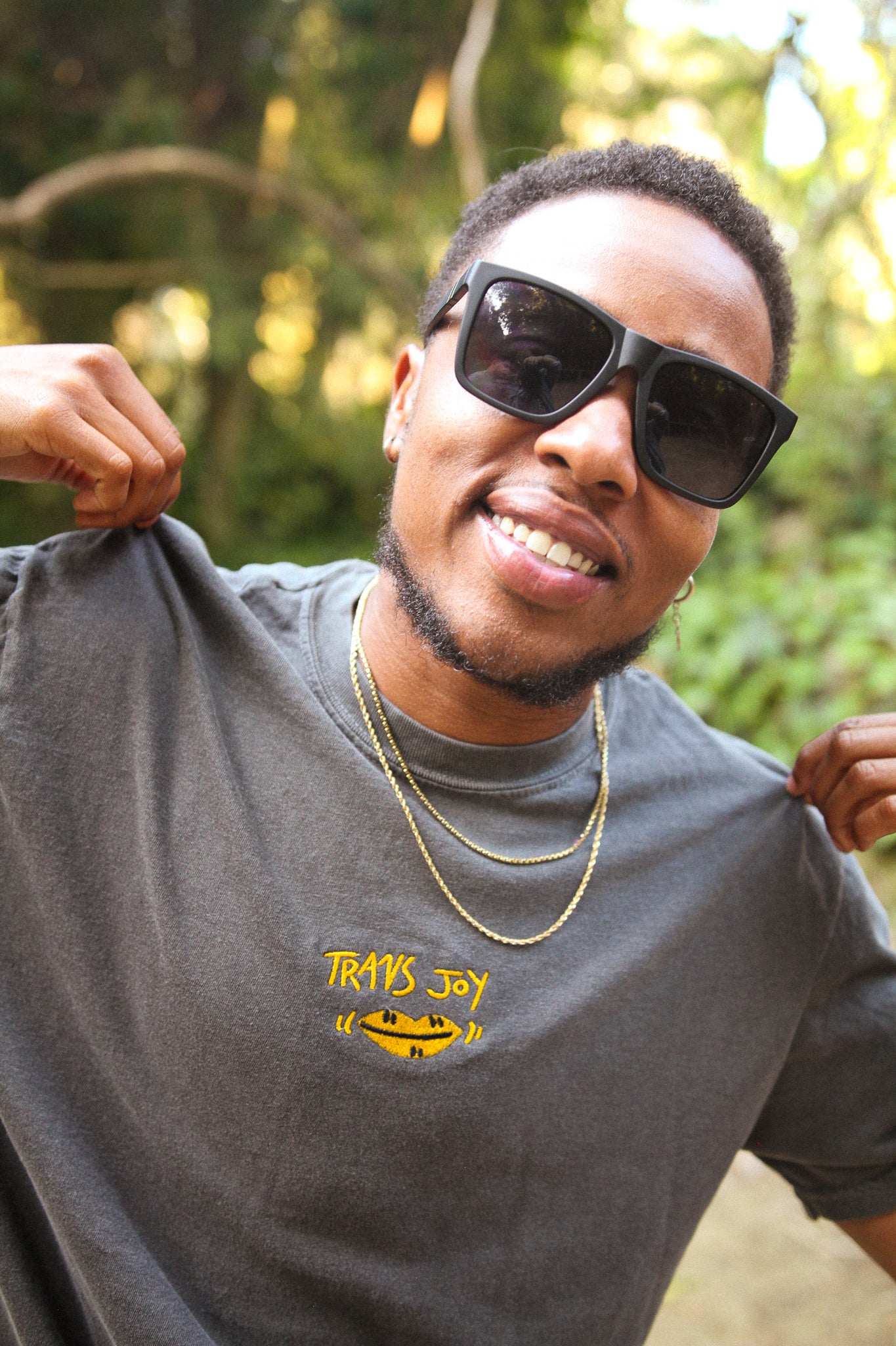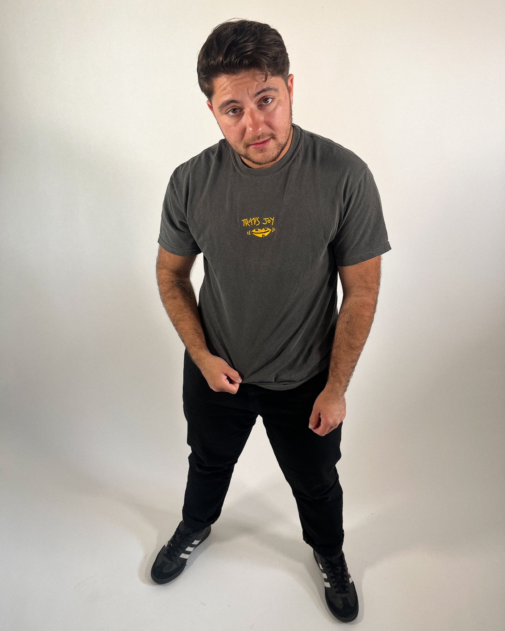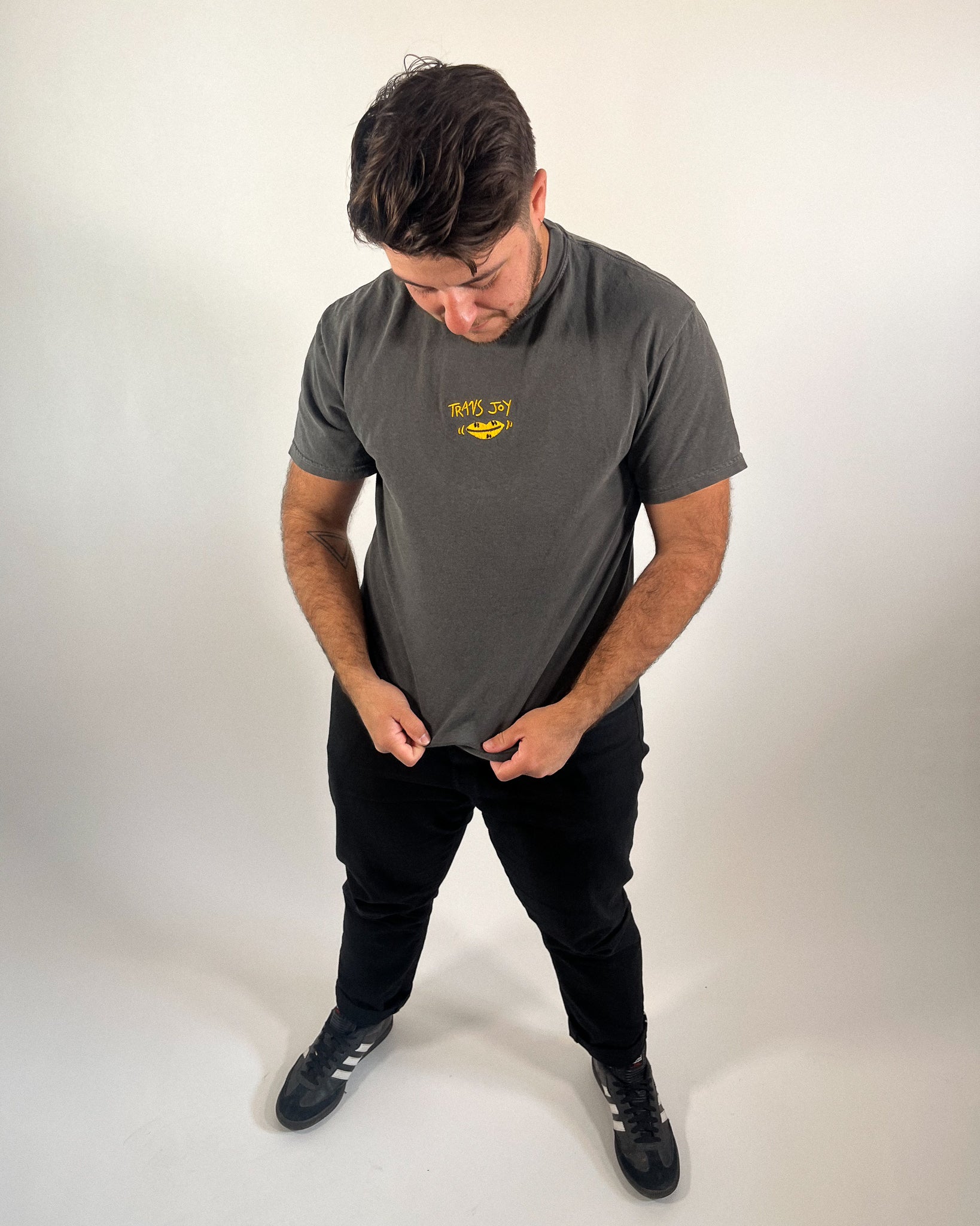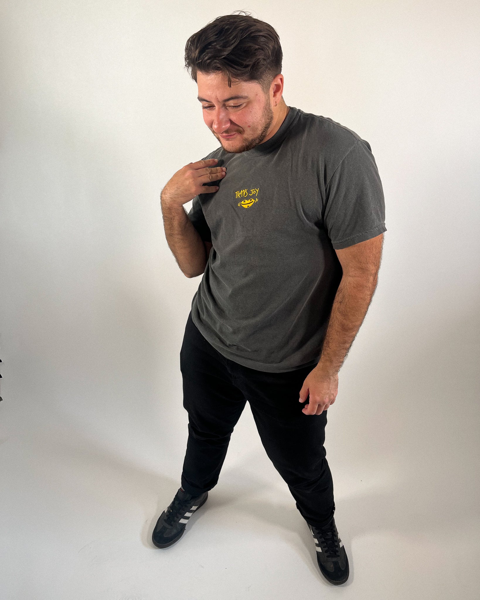 My Trans Joy embroidery tee is sure to make all the cuties check you out this pride season. Minimal and clean pride look for everyday wear or pride events