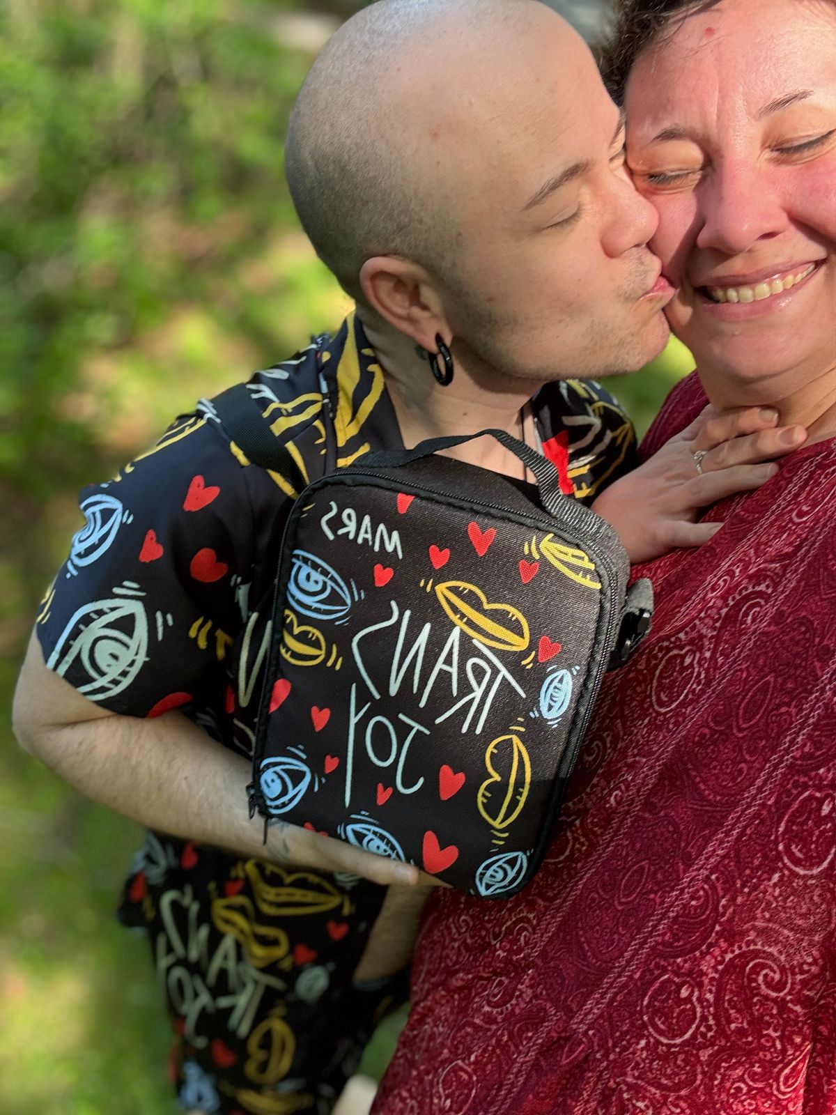 The satchel features the popular Trans Joy print design, making it a statement piece that spreads the message of Trans Joy wherever you go. It has a large storage space with a fixed strap for easy storage, as well as a side mesh bag, adjustable strap, and zipper closure.
